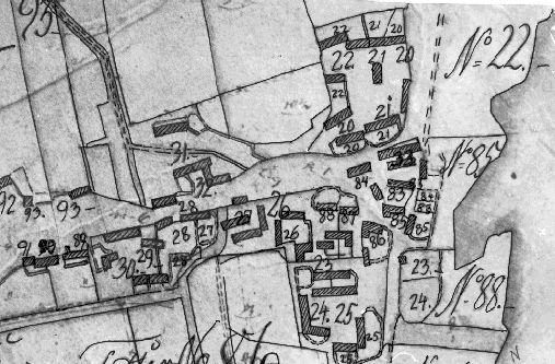 Udsnit af udskiftningskortet fra 1801. En del af Nederby med Bjerregaard øverst.